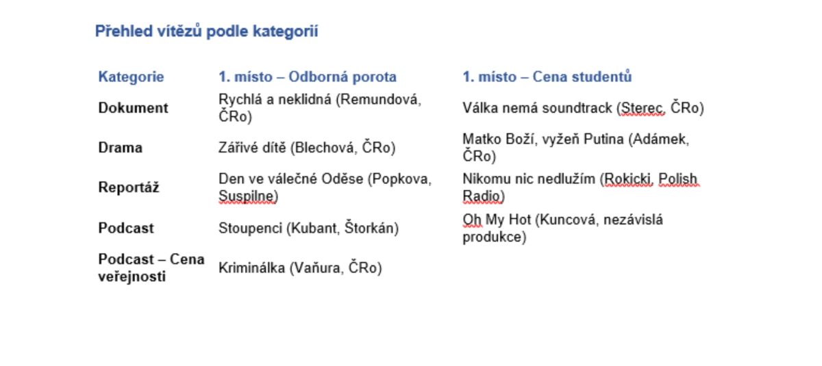 Studentská porota PBR udělila první místo protestu Matko boží, vyžeň Putina, druhé pořadí získal audioseriál Hovory a třetí Vděk.